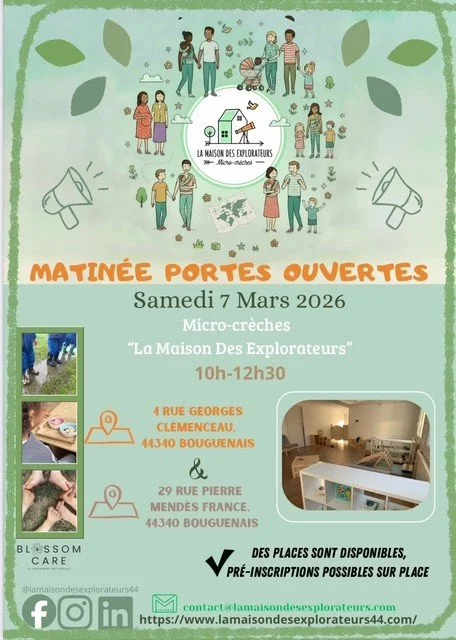 Nous vous attendons nombreux à l'occasion des Portes Ouvertes de notre micro-crèche de Bouguenais Les Couëts La Maison des Explorateurs.